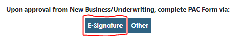 When you hit this button, a new page will pop up with the PAC information. If you chose to provide the banking info later on the original application, then this is where you will enter that information. If you had already provided the banking info, then you will just have to review that everything is correct. Then there will be a button on that new page to submit the PAC form. This will send the PAC form out to be e-signed by the client, then sent directly to New Business. If you hit the 'Other' button, it means that you plan on getting a wet signature to complete the form. Please note that once you confirm that you are getting a wet signature, the option to do the e-signing will disappear.